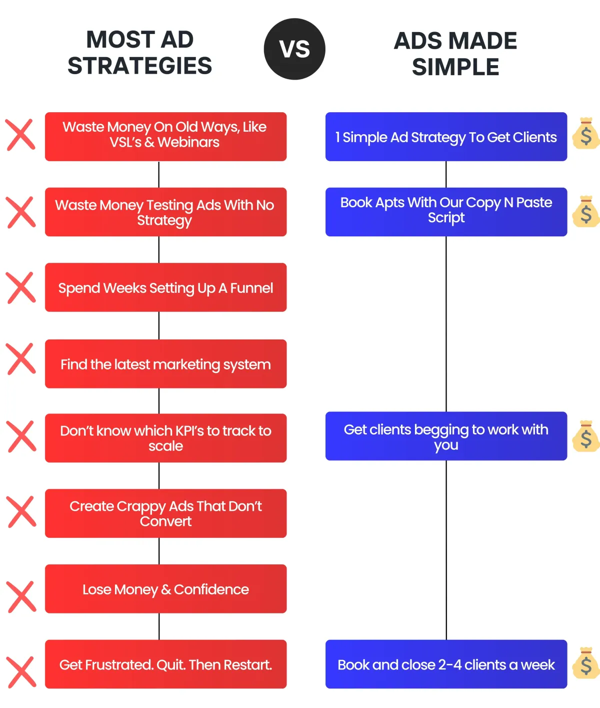 Ads Made Simple is an online course + scripts that helps online coaches, consultants, course creators, service providers and agency owners use one simple ad strategy to get more qualified leads & close more deals without wasting thousands of dollars on outdated strategies like VSL's ,Webinars, or the Group ad strategies.